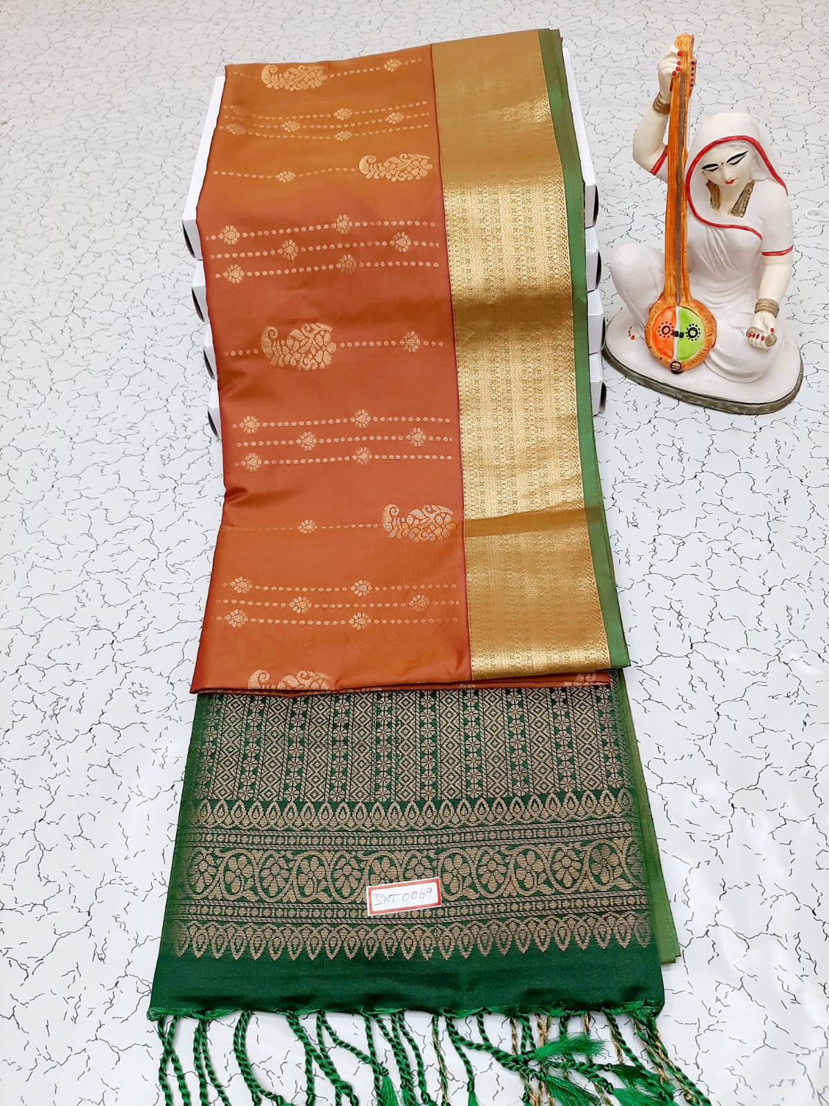 🌷Exquisite Design: Features elegant paisley (manga) buttas across the body with a rich, intricate zari border and pallu.